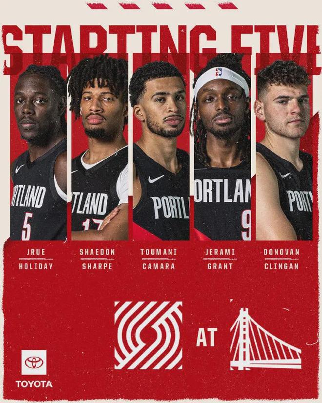 10月9日,開拓者季前賽首戰(zhàn)客場挑戰(zhàn)勇士。賽前,開拓者出具了本場比賽的首發(fā)名單:霍勒迪、夏普、卡馬拉、格蘭特、克林根。